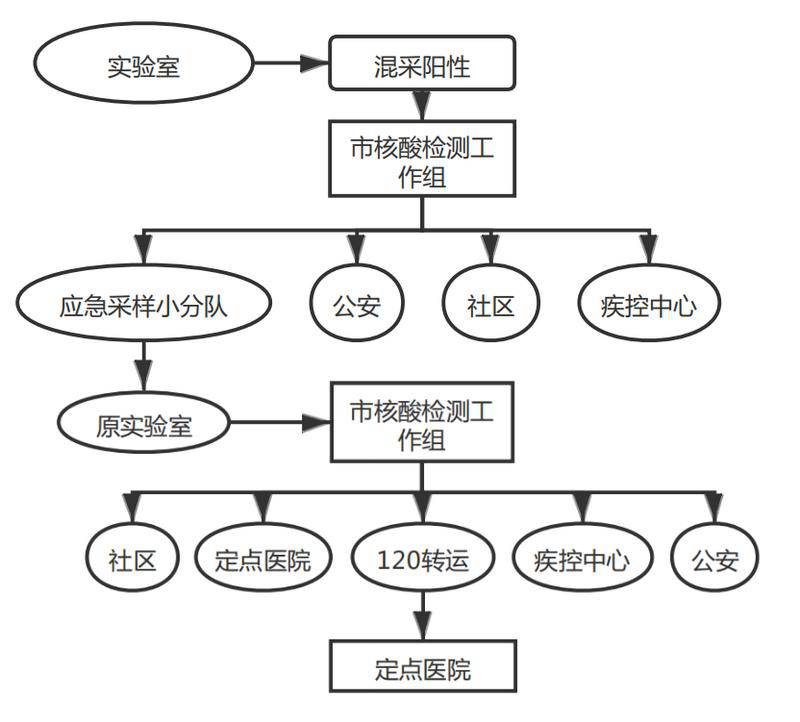1.单采检测阳性处置流程。单采样本检测结果阳性时,检测机构应当立即上报核酸检测工作组,工作组同时推送2条信息(阳性感染者基本信息、核酸检测阳性报告)至6个部门。一是通知120负压救护车进行阳性感染者转运。二是通知定点医疗机构准备接收该阳性感染者。三是通知阳性感染者所在社区(小区)确认并控制该阳性感染者及与其共同生活居住人员(密接)。四是通知公安机关协助进行阳性感染者转运,并开展该阳性感染者轨迹排查。五是通知疾控中心开展流调、密接排查、研判社区封控范围、疫点终末消毒等工作。六是通知疫情防控指挥部。上述6个部门同时推送、不分先后。