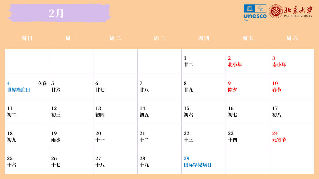 2024年,每月初,联合国教科文组织全球健康与教育教席(北京大学)会以日历方式公布本月主要健康主题日,以提醒广大青少年、家长和各界人士聚焦特定健康议题,了解相关知识,熟悉基本理念,掌握预防方法,提升健康素养。我们期望,这份日历不只是记录时间的工具,更是一个专注、倡导并传播健康知识和理念的介质和平台。 2月,我们特别关注两个重要的日子:世界癌症日和国际罕见病日。