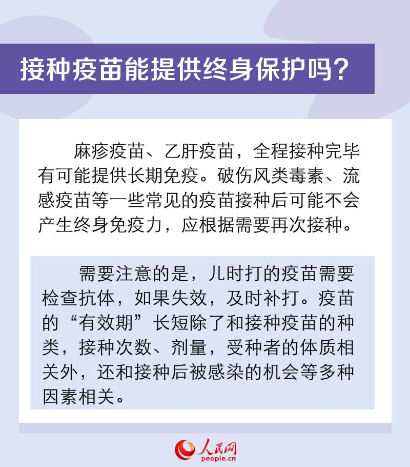 世界卫生组织将每年4月的最后一周定为“世界免疫周”,以强调免疫接种对于减少疾病、挽救生命的重要性。接种疫苗能提供终身保护吗?不同人群应接种什么疫苗?过敏还能打疫苗吗?为此,人民网采访了北京佑安医院感染综合科主任医师李侗曾。