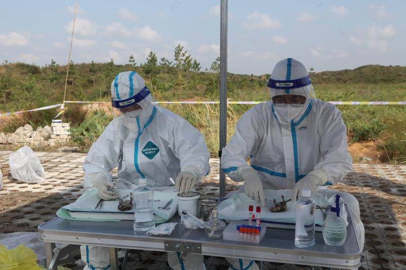 第三阶段为实战操作与快速检测。队伍选择以沙蒿、沙柳、臭柏为主要植被类型的半固定沙丘作为监测点,使用公顷夹日法对长爪沙鼠/黄鼠进行密度监测,完成2个样方调查;同时采取5米夹笼法开展夜行鼠监测,累计布笼400笼次,捕获子午沙鼠8只。现场使用胶体金快速检测技术对捕获鼠类进行鼠疫F1抗原检测,结果均为阴性。