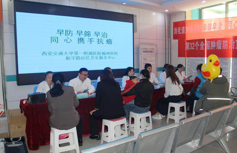 活动现场通过悬挂横幅、展示展板、专家答疑、健康宣教、便民检测等多种形式开展服务。来自西安交通大学第一附属医院榆林医院及榆林市星元医院的多学科肿瘤专家现场开展健康科普讲座,围绕常见癌症预防、高危人群识别、规范筛查流程等内容进行系统讲解。讲座结束后,专家团队为居民提供一对一健康咨询、诊疗建议等服务;医护人员免费开展血压、血糖测量服务;工作人员面向市民普及癌症可防可治理念,发放宣传资料与宣传物品,引导群众树立早预防、早筛查、早治疗的科学观念,推动健康生活方式深入人心。