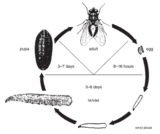 苍蝇属完全变态昆虫,整个发育过程分为卵-幼虫(蛆)-蛹-成虫四个时期。各类蝇种的发育时间与温度及环境有密切关系,如常见的家蝇在16℃时完成整个生活史需要20天,但在30℃时只需10-12天。